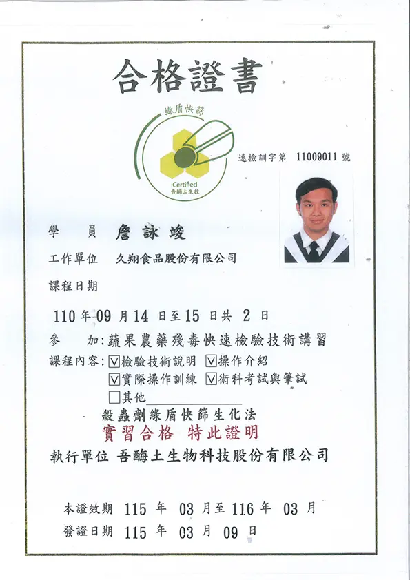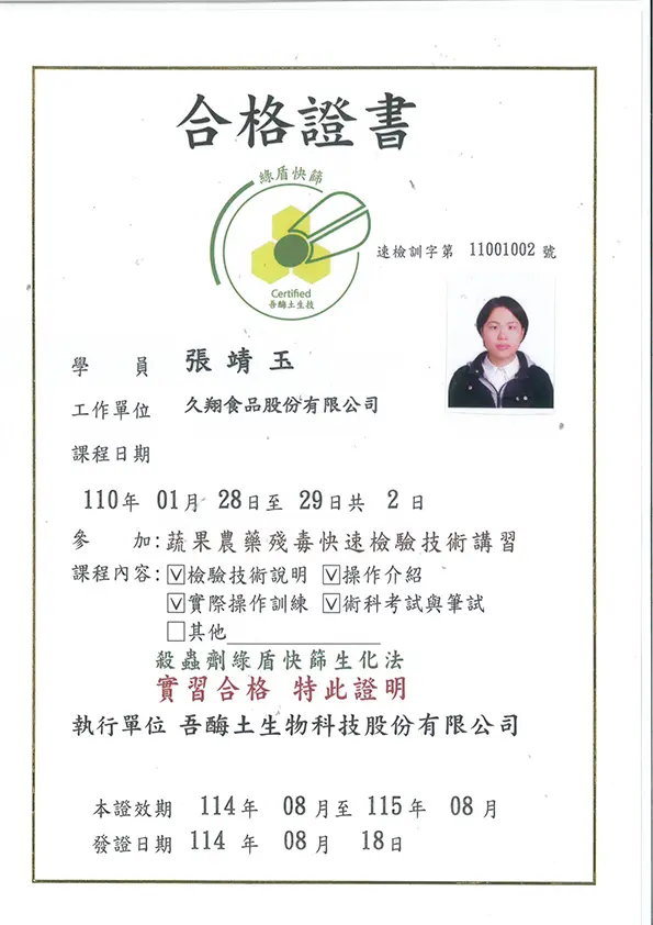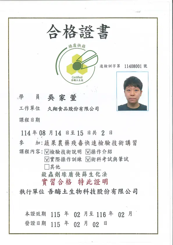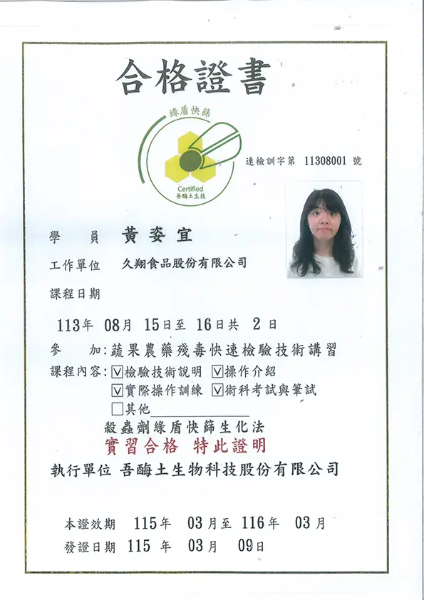 品保負責食品檢驗與分析,確保產品符合衛生標準,並處理相關報告,嚴格監控生產過程中的衛生管理,保障食品安全。衛生管理人員核備函 HACCP - A證書 HACCP - B證書 綠盾快篩檢驗(農藥檢驗) 食品檢驗分析乙級 食品檢驗分析丙級